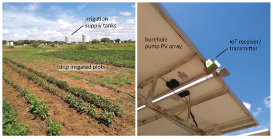 As part of the Kenya Resilient Arid Lands Partnership for Integrated Development (RAPID) project to manage the recently discovered Lodwar Basin Aquifer in northern Kenya, electrical current sensors were installed on solar-electric borehole pumps to monitor “water system functionality, the approximate number of pumping hours and volume extracted per day, and the last report date for the sensor” [86]. Data from the current sensors are transmitted via cellular or satellite network to a web server and dashboard where county government staff can monitor borehole use. While the pumped water serves a variety of community needs, some is used for irrigating small farm plots on municipal land that would otherwise be infertile (Figure 7). One of the keys to the success of this IoT implementation was the clear value and utility to the government officials responsible for the pumps, who indicated that access to the dashboard significantly reduced maintenance costs and pump downtime. The Kenya RAPID project also benefits from having a large, distributed, and well-coordinated team where each organization plays a clear role, including the supplier of the IoT technology. The sensor measurements have revealed detailed pump usage patterns in relation to rainfall [74], and this, coupled with a machine learning algorithm to predict failures and reduce detection time, has resulted in an increase in system-wide pump uptime from 70% to > 99% [87]. A risk for the project is the current reliance on grant funding, although the IoT component has now been incorporated into the county government budget.