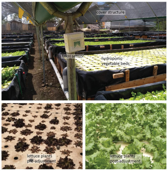 (top) Upande Vipimo temperature and relative humidity sensor in the aquaponics greenhouse at Kikaboni Farm. (bottom) Lettuce plants growing in the aquaponics beds before (left) and after (right) improvements to the growing environment.