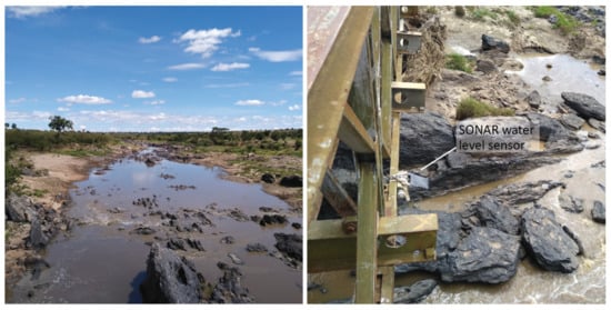The Mara River in the Maasai Mara National Reserve (left), and a SONAR level sensor installed on a bridge over the Mara River (right).