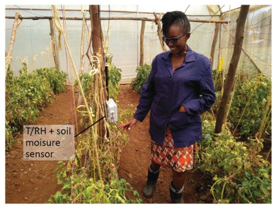 Greenhouses offer the opportunity for small farmers to grow high-value vegetables throughout the year in a controlled environment. However, uncontrolled greenhouse conditions can be harsh and damaging to plants. Researchers at the Dedan Kimathi University of Technology developed an IoT temperature, relative humidity, and soil moisture sensor coupled to an internet-connected gateway to assist farmers on their research farm (Figure 10) [34]. In this case, the system relies on the expertise of the farmers to interpret data and make the proper adjustments to the greenhouse. The farmers showed a high level of satisfaction with the system and reported that it had greatly improved productivity of tomatoes in their greenhouses. A key to the success of this project is the close connection and proximity between the IoT developers and the farmers, and the ability of the farmers to interpret the sensor measurements. This project is also equipping engineering students with the skills and experience needed to provide commercial IoT for agriculture solutions in Kenya [88]. A potential risk to the sustainability of this project is that steady funding is needed to build a pipeline of work given the expertise, location, and access to research agriculture facilities.