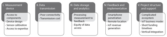Based on our literature review, expert interviews, surveys, and site visits, the team has synthesized a list of the challenges in IoT for smallholder agriculture in GFSS countries (summarized in Figure 12), and proposed recommendations for some of the relevant players involved. The following section is a summary of challenges grouped into five categories, which correspond to the IoT architecture in Figure 1: (i) measurement device, (ii) data transmission, (iii) data storage and analytics, (iv) feedback and implementation, and (v) project structure and support. A detailed discussion of the challenges, opportunities, and recommendations for the IoT for smallholder agriculture can be found in the full project report [25]. We believe that this section will be appealing to audiences beyond the academic and research community, and specific recommendations are segmented towards Technologists, Project managers, and Funders.