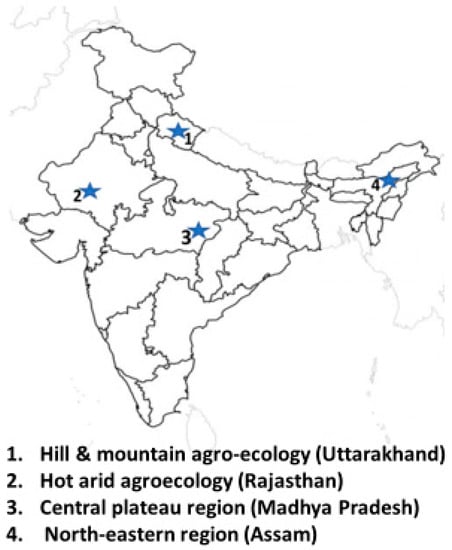 An exploratory study was undertaken in four distinct agroecologies of India, viz. hill and mountain, hot arid desert, central plateau, and the north-eastern region, to identify better community-level initiatives for bringing sustainability to farming and food systems. The study sites included representative agroecologies of the entire Uttarakhand hills (north-western Himalaya); parts of rural Jodhpur in western Rajasthan (hot arid desert); parts of the tribal Umaria district in Madhya Pradesh (central plateau); and parts of Assam-Jorhat and Golaghat (north-eastern region) (Figure 1). A total of 20 focus group discussion (FGD) meetings, involving a total of about 500 farmer households (HHs) from the entire Uttarakhand hills, were earlier organized and the above-listed four distinct interlinked marketing interventions were identified [3]. The feasibility of these interventions was worked out in the present exploratory study in the other three unique traditional farming agroecologies of India in 2019. Two focus group discussion meetings each were organized in these remaining three agroecologies and a total of about 500 farmer HHs were involved in all these (6 nos.) participatory interaction meetings. Altogether the information was documented from about 1000 farmer HHs for the present study.