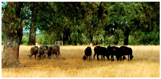 In this work, an experimental field of Montado (4 ha), located at Mitra Farm (38°53.1′N; 8°01.1′W), was monitored. The predominant soil in this parcel is classified as Cambisol, the major reference soil group in Portugal [2], derived from granite and characterized by low fertility, cultivated under a mixed, agro-forestry production systems [1]. These soils are generally characterized by their coarse texture (mostly sandy loam), small cation exchange capacity (CEC), organic matter content (≤1%), and water holding capacity, and strong acidity (pH ≤ 5.5 in water) [2]. This ecosystem consists of dryland biodiverse pastures, Quercus ilex ssp. rotundifolia Lam. trees, and is grazed by sheep. During the experimental period, the whole field was occupied by adult sheep in maintenance, none of which were pregnant or lactating. The animals were kept on each of the plots in continuous grazing, at an annual stocking rate of eight animals per hectare. The sheep flock consisted of a mixture of Merino White and Merino Black breeds (Figure 1). Herd management consisted only of vaccinations and deworming according to the health management calendar, a hay supplementation during the autumn period, and a commercial protein supplement in the summer. The animals had permanent access to blocks of mineral salt with macro- and micronutrients.