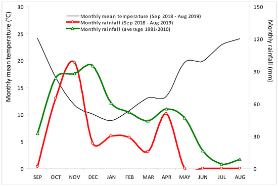 The Mediterranean climate is characterized by most of the rainfall concentrated in the winter and very dry, hot summers. The average monthly temperature varies between about 8 °C in January and around 25 °C in August, with minimum temperatures close to 0 °C between December and February and maximum temperatures above 40 °C in summer. The annual accumulated precipitation in the region varies between 400 and 650 mm, distributed mainly between October and March, and practically nonexistent in summer. Figure 2 illustrates the thermo-pluviometric diagram of the Meteorological Station of Mitra (Évora, Portugal). This figure shows the evolution of the monthly mean temperature and monthly rainfall between September 2018 and August 2019, and the average monthly rainfall in a 30-year period (between 1981 and 2020). In the agricultural year of 2018/2019 and relative to the normal average for the region, the figure shows a reduction of 60% in the monthly rainfall between December and June (148 mm versus 370 mm).