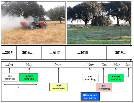 Chronological diagram of activities carried out between October 2015 and June 2019 at the Mitra experimental field for monitoring the effect of dolomitic lime application on pasture productivity and quality. ECa, soil apparent electrical conductivity; RFE, relative field elevation. Note: * Soil sampling in 2015 and pasture sampling in 2016 were carried out only in the original area of 2 ha.