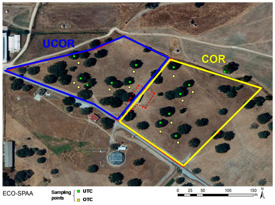 Experimental field: location of 24 sampling points (12 in the amended area (COR) and 12 in the unamended area (UCOR)). Half of sampling points were installed under tree canopy (UTC) and half outside tree canopy (OTC).
