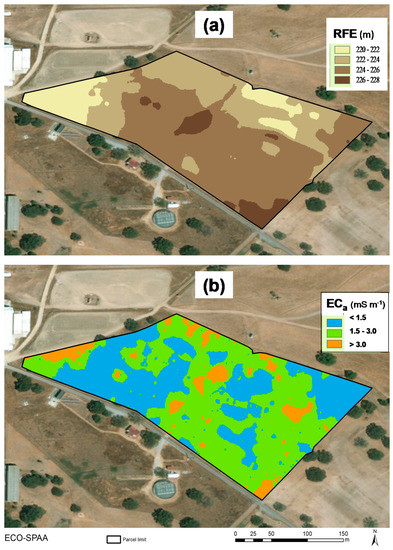 In addition to acidity, the soils of this region of Portugal have some other characteristics that affect crop productivity. Figure 5a shows the relative field elevation (RFE) map of the experimental field, with undulated relief typical of the southern region of Portugal, and an 8-m difference (220–228 m) between the highest and the lowest altimetry. Altimetric information is important inasmuch as it affects soil drainage and fertility [15], the major drivers of the productivity in dryland pastures [16]. Figure 5b shows the soil apparent electrical conductivity (ECa) map, with a mean value of 1.7 ± 0.2 mS·m−1, which reflects the sandy loam texture (sand = 80.6 ± 2.3%; silt = 10.1 ± 1.7%; and clay = 9.3 ± 1.4%) and other structural limitations of these soils [17]. The spatial information that results from the combination of these surveys (altimetry and ECa) has a great potential for principal component analysis (PCA) in order to identify and define soil management zones) and select the factors that determine crop yield [15,18,19].