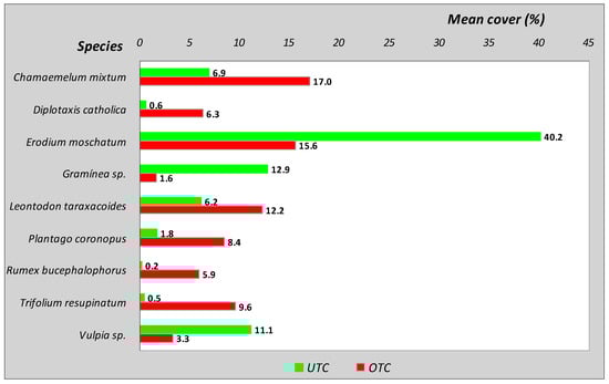Figure 6 shows the predominant botanical species of the biodiverse pasture of the studied field evaluated in spring 2016, UTC and OTC. These nine species represent approximately 80% of the total mean cover. Most of these species are annuals, with pronounced patchiness of vegetation communities and marked seasonality of plant cycles, which germinate according to yearly environmental conditions (e.g., temperature and rainfall); consequently, the species composition of grassland in Montado can have a high inter-annual variability [9]. The most representative species are the Erodium moschatum (UTC) and the Chamamelum mixtum (OTC). This spatial variability of the botanical composition is caused by changes in the microclimate (mainly shade tolerance), soil properties, and livestock grazing [9].