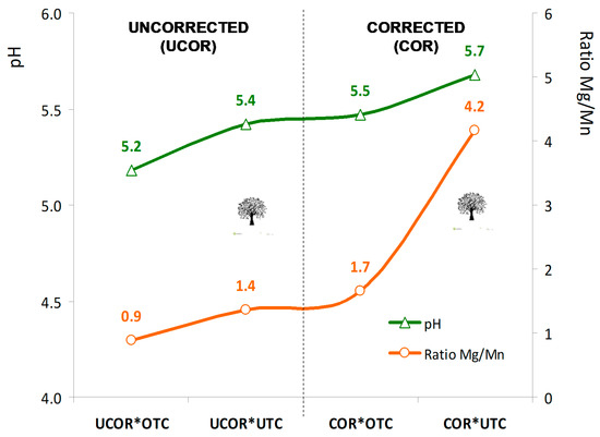 The sustainability of these large cork and holm oak areas is, nevertheless, currently threatened by forecasted climate changes and inappropriate management practices [24]. In the Southern region of Portugal, it is common practice to apply phosphate fertilizers at intervals of two or three years with the aim of improving the fertility of these poor soils [4]. However, the impact of this improvement on pasture productivity is conditioned by an objective limitation: soil acidity. The yield of crops in these Cambisols developed on granitic formations is generally poor as a consequence of the Mn toxicity [2]. In this study, the surface application of dolomitic lime (2000 kg·ha−1) in November 2017 had a direct impact on soil pHH2O (from 5.4 ± 0.3 in 2015 to 5.6 ± 0.2 in 2018), with a clearer effect UTC areas (mean pHH2O = 5.7) than in OTC areas (mean pHH2O = 5.5) (Figure 7). These results show that surface lime application was an efficient practice for increasing pH and reducing the exchangeable acidity [25]. However, the application of amendments does not increase much the soil pHH2O immediately, but rather gradually over time [26]. This is in line with other studies [27], which also reflects the way in which lime was applied in the field (surface application, not incorporated into the soil through mobilization). The application also had a positive and significant effect on the Mg/Mn ratio, increasing from close to 1 in UCOR areas to more than 4 in COR × UTC areas (Figure 7). This aspect is particularly important since Mn toxicity has long been recognized as an important factor limiting plant growth on acid soils [2]. The result of this toxicity is a reduction in the soil productive potential, conditioning, in the case of biodiverse pastures, its floristic diversity, which makes them less interesting from an agronomic and nutritional point of view [2]. According to Halim et al. [26], soil amendment is suitable for two primary categories of problems, including reducing contaminant bioavailability/phytoavailability and improving poor soil health and ecosystem function, since it improves cation exchange capacity (CEC), increases water holding capacity and re-establishes microbial communities as well as soil structure by alleviating compaction.