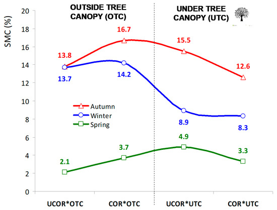 Pattern of average soil moisture content (SMC) in the 0–0.20 m layer during the vegetative cycle of pasture (corrected (COR) and uncorrected (UCOR) areas; and under tree canopy (UTC) and outside tree canopy (OTC) areas).