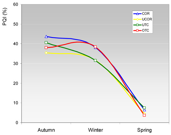 Evolution of the pasture quality index (PQI) during the vegetative cycle (corrected (COR) and uncorrected (UCOR) areas; and under tree canopy (UTC) and outside tree canopy (OTC) areas).