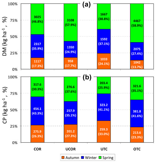 Evolution of: (a) pasture dry matter yield (DM); and (b) pasture crude protein (CP) accumulated in each season of the vegetative cycle, both in kg·ha−1 and as a percentage of total (corrected (COR) and uncorrected (UCOR) areas; and under tree canopy (UTC) and outside tree canopy (OTC) areas).