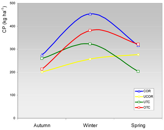 Evolution of pasture crude protein availability (CP, in kg·ha−1) during the vegetative cycle (corrected (COR) and uncorrected (UCOR) areas; and under tree canopy (UTC) and outside tree canopy (OTC) areas).