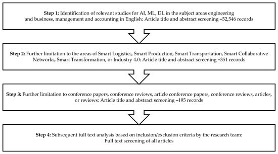 In the third step, the research was limited to conference papers, conference reviews, articles, or reviews to consider only high-quality studies. In sum, the final meta-search query was formulated as follows: (TITLE-ABS-KEY (“artificial intelligence” OR “machine learning” OR “deep learning”) AND TITLE-ABS-KEY (“smart logistics” OR “smart production” OR “smart transportation” OR “smart collaborative networks” OR “smart transformation” OR “industry 4.0”)) AND (LIMIT-TO (DOCTYPE, “cp”) OR LIMIT-TO (DOCTYPE, “ar”) OR LIMIT-TO (DOCTYPE, “cr”) OR LIMIT-TO (DOCTYPE, “re”)) AND (LIMIT-TO (SUBJAREA, “ENGI”) OR LIMIT-TO (SUBJAREA, “BUSI”)) AND (LIMIT-TO (PUBYEAR, 2019) OR LIMIT-TO (PUBYEAR, 2018) OR LIMIT-TO (PUBYEAR, 2017) OR LIMIT-TO (PUBYEAR, 2016) OR LIMIT-TO (PUBYEAR, 2015) OR LIMIT-TO (PUBYEAR, 2014)) AND (LIMIT-TO (LANGUAGE, “English”)).