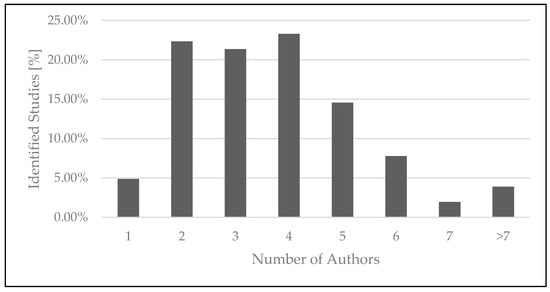 Five papers (4.85%) were published by one author, 23 papers (22.33%) were published by two authors, 22 papers (21.36%) were published by three authors, 24 papers (23.30%) were published by four authors, 15 papers (14.56%) were published by five authors, eight papers (7.77%) were published by six authors, two papers (1.94%) were published by seven authors, and four papers (3.88%) were published by more than seven authors.