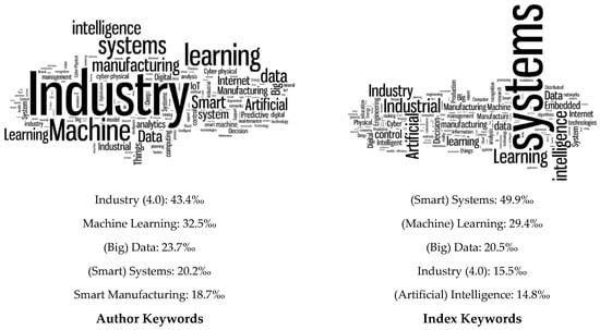 The keywords were analyzed by using the software packages IBM SPSS Statistics 24 (IBM, New York, NY, USA) and Wordle (www.wordle.net, California, CA, USA). Thereby, the size of the words and letters reflects the frequency of the keywords from the final sample of 103 full papers. As expected, the most important author keywords are “Industry (4.0)”, “Machine Learning”, “(Big) Data”, “(Smart) Systems”, and “Smart Manufacturing”. Moreover, the top-ranked index keywords are “(Smart) Systems”, “(Machine) Learning”, “(Big) Data”, “Industry (4.0)”, and “(Artificial) Intelligence”.