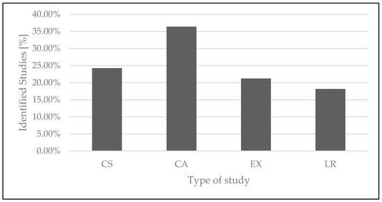 The following Figure 5 displays the classification of the relevant research study by the type of study, divided into Case Study (CS), Conceptual Approach (CA), Experiment (EX), and Literature Review (LR). The classification is based on the content analysis and subsequent assignment of the works to one main type of study by the research team.