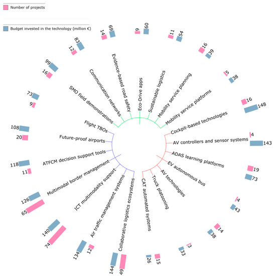 Top 7 technologies linked to the smart mobility and services (SMO), cooperative, connected and automated transport (CAT) and network and traffic management systems Strategic Transport Research and Innovation Agenda (STRIA) roadmaps. Transport Research and Innovation Monitoring and Information System (TRIMIS) data using the interactive tree of life [34]. Abbreviations—ADAS: advanced driver assistance systems; CAT: connected and automated transport; AV: autonomous vehicle; EV: electric vehicle; TBO: trajectory-based operation; ATFCM: air traffic flow and capacity management; ICT: information and communication technology. SMO-related technologies in green, CAT-related technologies in red and NTM-related technologies in blue.