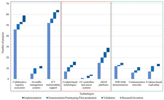 Even though the roadmap technology clusters are not comparable among them, the general observation is that most of the technologies have been researched in framework programmes at low development phase levels. This is more evident for two out of three dominant technologies within the NTM roadmap (i.e., collaborative logistics ecosystem and ICT multimodality support). On the contrary, the AV controllers and sensor systems category in the SMO roadmap, which has been researched only in four very large-scale projects, has reached a higher maturity.