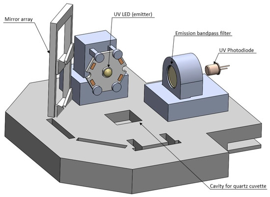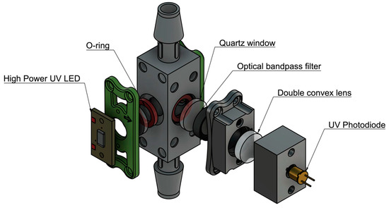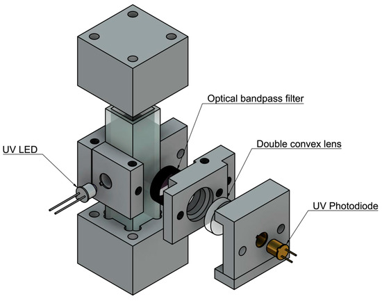 Based on the results found in the detection limits part of this study, a field-deployable product design approach was employed. The sensitivity of the instrument was optimized by completing successive experiments with differing components and placement. First, a static system was designed and optimized using a UV quartz cuvette (FireflySci) containing the sample water. Components were held in place by 3D printed parts designed in Autodesk’s Fusion360 and printed on a Formlabs Form2 stereolithography printer. The initial prototype components include a UV-LED centered around 280 nm (Marktech Optoelectronics) with no secondary optical bandpass filter; a UV Photodiode centered around 350–360nm (Marktech Optoelectronics), a double converging lens with UV transmission coating (Edmund Optics), and an emission bandpass filter (Edmund Optics), shown in Figure 2.