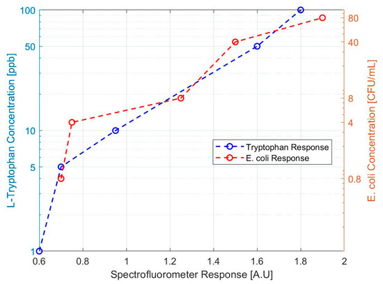 Spectrofluorometric response to tryptophan and E. coli test solutions. The response of the bench scale prototype to L-tryptophan concentrations is compared to the response of E. coli dilutions.