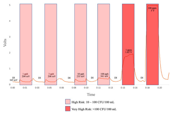 Initial results from laboratory testing of this the flow-through prototype are shown in Figure 5. Inputs include deionized water, 1 ppb, 3 ppb, 10 ppb, 100 pbb, 1 ppm, and 100 ppm tryptophan solution. As illustrated in Figure 5, we have a clear response at 1 ppb, which, from the literature [24], corresponds to a “high risk” of fecal contamination in drinking water.