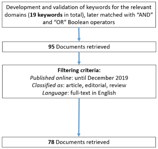 First, we identified the two research fields pertinent to the analysis: “web 2.0”, and “destination marketing”. Second, for each of the aforementioned fields, the researchers elaborated a set of meaningful keywords: the keywords identified encompass “destination marketing”, “web 2.0”, “social media”, “social network site”, as well as a list of terms covering the most popular social networking sites (SNSs) such as “Facebook”, “YouTube”, “WhatsApp”, “Weixin”, “WeChat”, “Instagram”, “Douyin”, “Tik Tok”, “QQ”, “QZone”, “Sina Weibo”, “Reddit”, “Snapchat”, “Twitter”, “Pinterest” and “Kuaishou” [12], and travel specific social networks such as TripAdvisor. Third, we used the keywords identified in the previous stage to develop search queries/strings deploying the Boolean operators “OR” and “AND”. In line with [13], the search queries were performed using the database Scopus, currently indexing more than 70 million items including almost 22,800 active serial titles from over 11,000 publishers. The database was chosen as its coverage is nearly 60% larger than Web of Science’s (WoS) [14]. We also conducted a robustness analysis and performed the same search queries in WoS and detected that the number of the documents collected from Scopus was consistently higher than the number of those collected from WoS and that those gathered using WoS represented a subsample of those covered by Scopus. Without adding any further limitation criteria, the search query returned 95 results. Fourth, we further refined the query by including further selection criteria, ensuring that the document had to be (1) published up until the end of 2019; (2) written in English; and (3) classified as an article, an editorial or review. The refined query returned 78 document results. Figure 1 illustrates the data collection process.