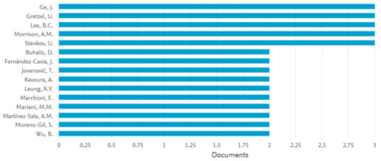 As is clear from the above figure, the first few articles dealing broadly with Web 2.0 technologies for destination marketing were published between 2008 and 2011, thus witnessing that the research object of this literature review is relatively novel. This seems to reflect, with a lag of 3–4 years, the timing of the adoption of Web 2.0 platforms by marketing managers after their introduction in the marketing practice: Facebook, for instance, was launched in 2004, but started becoming part of the toolset of digital marketers starting from 2005 and so Twitter was launched in 2006 as a pivot of the podcasting platform Odeo, but the first contributions dealing with it date back to 2012 [15]. After a relevant growth over the period 2011–2013, the next relevant increase takes place over the period 2017–2019. Certainly, the recent development of this research area mirrors (1) the relatively recent adoption of Web 2.0 technologies for destination marketing purposes; and (2) the increasing scholarly interest in the role, drivers and use of Web 2.0 for effective destination marketing over the last decade. The most prolific authors based on the database are identified and illustrated in Figure 3. Interestingly, scholars have originally approached the focal research stream from two perspectives based on their expertise: on the one hand, ICTs applications to the tourism sector (e.g., D. Buhalis, U. Gretzel, and M. Mariani), and on the other hand, tourism destination marketing and management (e.g., S. Moreno-Gil and A.M. Morrison). Furthermore, we can identify recurring collaborative research within the following teams: (a) A.M. Morrison and U. Stankov; (b) A. Almeida-Santana and S. Moreno-Gil; (3) A.M. Morrison and B. Wu; (4) M.M. Mariani, M. Di Felice and M. Mura; and (5) J. Ge and U Gretzel. It appears that most of these collaborations are (1) driven by a common interest of the research team in specific destination countries located in a specific geographical region where the scholars are based (e.g., A. Almeida-Santana and S. Moreno-Gil have mainly focused on European markets), and (2) tend to focus on a specific technology or SNS because the research team is particularly knowledgeable about that Web 2.0 platform (e.g., Ge and Gretzel).