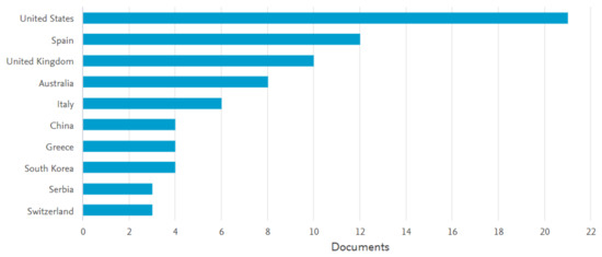 Regarding the geographic distribution of documents by country, the contributing scholars display overwhelmingly an affiliation with US, Spanish or UK academic institutions (see Figure 4). This seems to mirror the historical development of destination marketing and management as a practical and research field. Indeed, as well noted by Pike and Page [16], the first DMOs and destination marketing teams were established in the UK and US between the end of the 19th century and the first half of the 20th century.