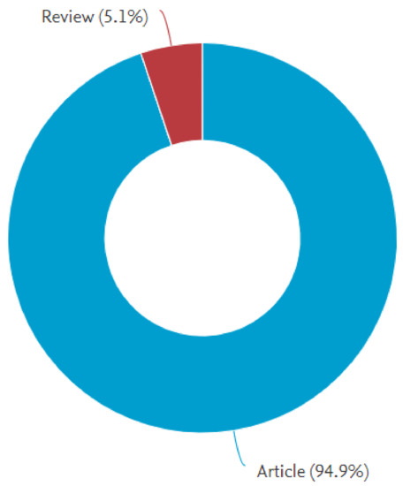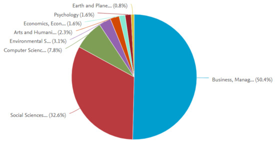 The most active funding sponsors are based in Spain and China. As far as the types of document are concerned, 94.9% are articles, while the remaining (marginal) part (5.1%) are classified as reviews by Scopus (see Figure 6). Regarding the subject area, more than half (50.4%) of the documents pertain to the business, management, and accounting areas; 32.6% can be ascribed to the wide social sciences area, and the rest can be prevalently classified into the computer science (7.8%) and environmental sciences (3.1%) areas (see Figure 7).