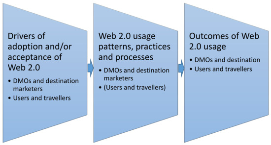 The drivers of adoption and acceptance of Web 2.0 technologies by DMOs and destination marketers have been examined in relation to several factors: the opportunities and costs of developing SNSs [19,56,64,65,66]; the budget, resources and time constraints [9,36,49,67,68]; the skills, knowledge, experience and competences needed to deploy Web 2.0 technologies professionally [23,69]; the social capital and trust requirements [35]; the need to develop and nurture a virtual community [70]; and the connectivity to other ICT websites [58].