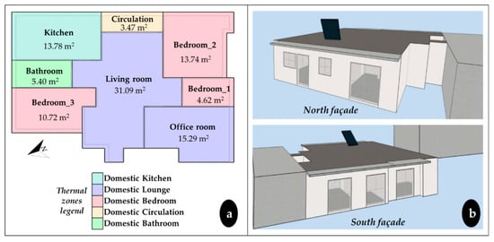 (a) Plan of the apartment and thermal zones, (b) render view.