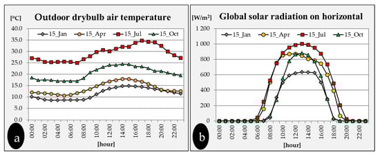 Four days, each representative of a season, have been chosen from which the hourly climatic data used in the simulations are shown in Figure 2: one day of winter (15 January), one day of spring (15 April), one day of summer (15 July) and one day of autumn (15 October). On January 15 the outdoor dry-bulb air temperature has a maximum value of 14.9 °C (at 15:00) and a minimum one of 8.7 °C (at 5:00 and 6:00). On July 15th, a peak of 34.8 °C is reached at 17:00 and a minimum value of 25.0 °C at 7:00. On April 15th, the air temperature is from 10.7 °C (at 5:00) to 18.0 °C (at 14:00), while on October 15, it ranges from 17.0 °C in the early morning to 24.5 at 14:00. The mean value of global solar radiation during the sunny hours of the winter day is 434 W/m2, for the spring day 636 W/m2, for the summer day 644 W/m2 and 498 for the autumn day.