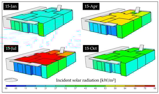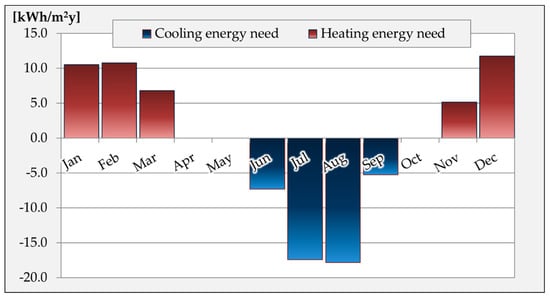 Based on the numerical model, some information about the thermal performance of the building envelope, in the state of fact, has been carried out. Regarding the thermal needs, the monthly trend is reported in Figure 3. The total cooling need, of 47.8 kWh/(m2y), is slightly greater than the total heating need, of 45.0 kWh/(m2y).