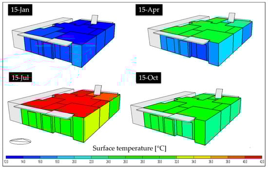 From the literature reviews, it became clear that the reduction of the inside surface temperature of the walls reflects the external surface variation. The study of the climatic solicitations can be used for choosing the best position of a green system. Within the capabilities of the used tool, the visualization of the incident solar radiation and surface temperature on each external surface of building elements has been realized. Figure 4 and Figure 5 report the daily average for the South-East and South-West exposures. The most radiated surfaces are the roof and the East walls with the maximum values being reached on the 15th of July, as can be seen in Figure 4. The south wall is shaded by a horizontal overhang (1 m depth). Moreover, in Figure 5 the mean daily value of the external surface temperature is shown. It is directly connected to the urban heat island phenomenon and reflects what has been said about irradiated surfaces. The hottest surfaces for the analyzed days are both the East walls and the roof. This fact will be considered for the design process of the green system.
