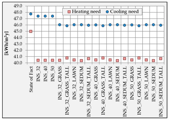 Considering the cooling and heating energy needs of the whole apartment, the results of the 18 cases simulated are displayed in Figure 6. In the nomenclature of the configurations “INS” stands for “insulation” and the subsequent number is the density value (ρ = 32/40/50 kg/m3). Moreover, the addition of the green system is reported with the name of the relative plants. The heating need decreases with the application of insulation and it remains almost constant, or increases just slightly, by adding the green. On the other hand, the cooling need shows a slight decrease with the application of insulation and a more apparent decrease by adding the green.