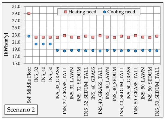 Based on these considerations, the same parametric analysis called “Scenario 2” has been conducted considering the hypothesis of the construction of a new inhabited residential floor above the one under investigation. In this way, the shape ratio is reduced and the East wall surface weighs more in the thermal balance (≈40%). The results are shown in Figure 7 (“SoF” states for “state of fact”) and Table 9. The application of the LW brings a reduction in heating need of about 21% to 23% and in cooling need of about 18%, with respect to the base case where the apartment is supposed to be on the middle floor of the building. The winter penalty by using a green system is also more evident if the percentage of reduction compared to the only-isolated wall is analyzed (≈2%).