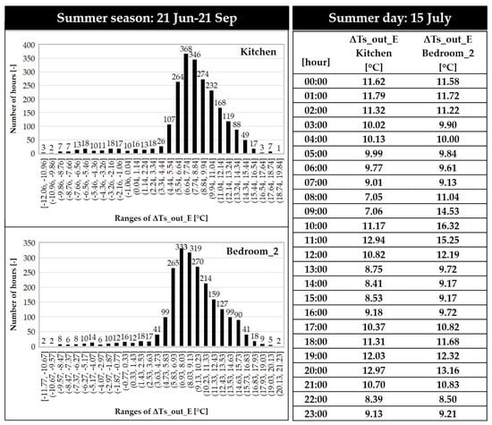 Regarding the urban level, the main index considered is the difference of the outside surface temperature of the wall, both before and after the application of the green system on the East façade, ΔTs_out_E. The latter is shown for the only two rooms involved in the wall refurbishment, being the Kitchen and Bedroom_2. In Figure 8 the hourly values are reported for the summer day, 15 July. The average decrement of surface temperature is about 10 °C for the kitchen and 11 °C for the bedroom. The great values are reached at 10:00 and 11:00 in the morning and around 8:00 p.m. Decrements ranging from null to 5 °C have occurred during the winter, spring, and autumn reference days. Considering the whole summer period, from 21 June to 21 September, the isograms in Figure 8 show the number of hours in which the ΔTs_out_E index falls within a certain range. It is evident that for almost all hours this value is positive, indicating a reduction in surface temperature. The ΔTs_out_E is inside the range of 6–11 °C for 67% of the time range on the Kitchen wall and 63% on the Bedroom_2 wall. The mean values throughout the season are 8.13 °C and 8.88 °C for Kitchen and Bedroom_2, respectively. These results are comparable to the decrement value that could be calculated from [27] for the east wall (≈11.5 °C), during a similar period with quite the same climate.