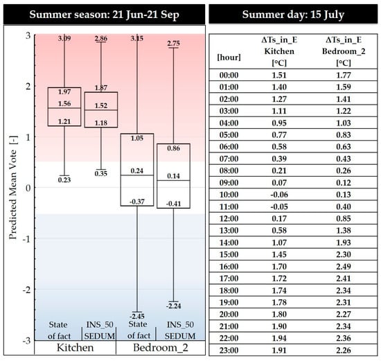 For all hours of the summer season (from 21 June to 21 September) the Predicted Mean Vote (PMV), according to the [49] standard, has been carried out. The level of clothing insulation has been set equal to 0.5 Clo, while the metabolic rate equals to 90 W/people for the bedroom and 160 W/people for the kitchen. The results are reported in the box-plot in Figure 9, in which the comfort zone has been depicted in white, the zone with PMV greater than 0.5 in red, and the one with PMV lower than −0.5 in blue. The difference between the first and the third quartile (box) is apparent, as well as the difference between the maximum and the minimum data (whiskers), decrease after the application of the LW. Moreover, the medians (vertical bars) decrease, getting closer to the comfort zone. It is also noted that for the kitchen, in both cases, the PMV distribution is far from the optimal thermal zone. This mainly depends on the high internal thermal load (≈155 Wh/m2day) with respect to the bedroom (≈28 Wh/m2day).