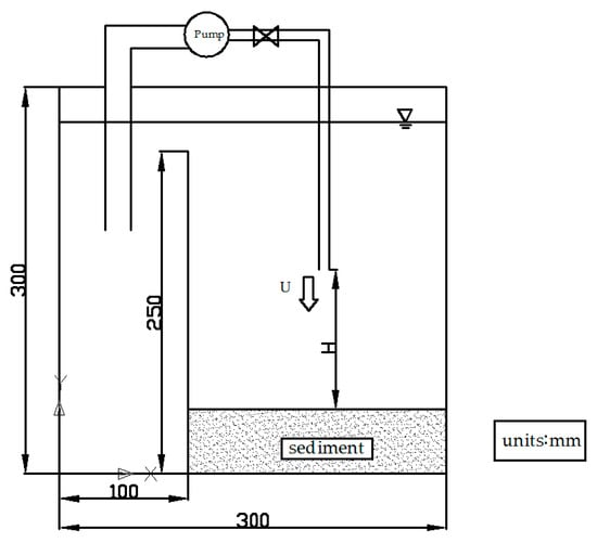 The experimental investigation was conducted in a cubic acrylic tank with a side length of 30 cm, as shown in Figure 1. A vertical panel which divided the flume into two chambers to reduce cross flow was set 10 cm from the flume wall. Water in the left chamber was lifted up by an electric pump and then entered into the right chamber as downwelling flow. The downwelling pipe was set vertically along the center axis of the right chamber with a nozzle diameter of 0.8 cm. The height of the discharge point was adjusted by moving the pipe up and down. Below the discharge point was the sediment layer.