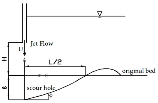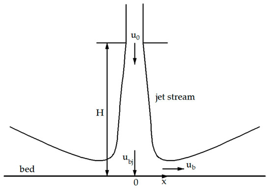 where ubj refers to the vertical flow velocity near the sediment bed, C3 is a proportionality coefficient, H is the vertical distance from the nozzle to the sediment surface, and x is the horizontal distance in the transition flow direction from the impinging point. Figure 3 is an axial symmetric view of the jet.