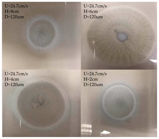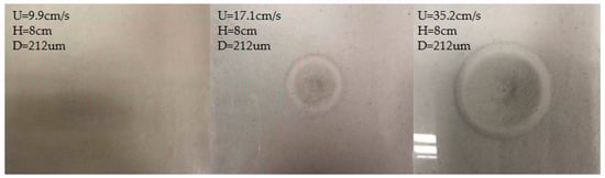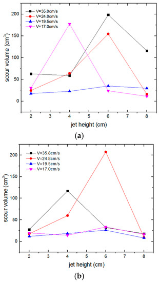 Figure 6 is a photo of scour hole variation with jet height. Figure 7a–c shows the effects of jet height on the volume of the scour hole when D = 75, 120, and 212 µm. From the recorded data, it is apparent that the volume of the scour hole did not keep increasing as the jet height decreased. The critical height was defined once the scour hole reached its maximum volume. A reasonable explanation for this is that an impinging jet tended to be narrower under a smaller jet height, where little hydrodynamic effect was produced beyond the scour hole to remove suspended particles.
