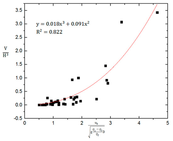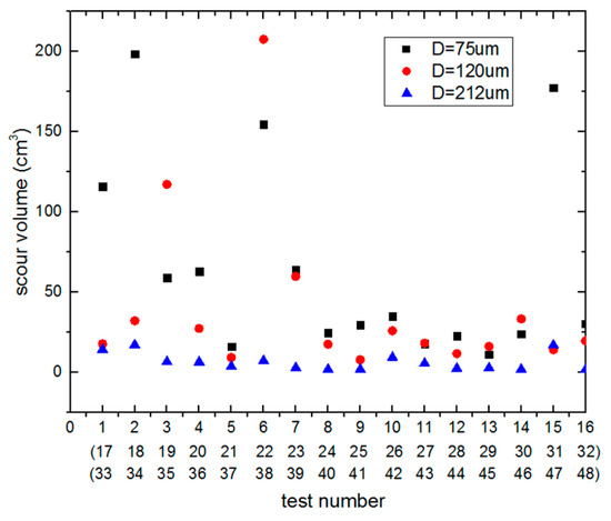 Figure 8 presents the distribution of scour volume with different diameters of sediment particles. Obviously, all of the data for the particle size D = 75 µm were greater than those for the particle size D = 212 µm. This can be explained by the fact that larger particles needed a greater hydrodynamic force for incipient motion and it was more difficult to resuspend them. However, the data for D = 120 µm were not totally distributed between the data for D = 75 µm and D = 212 µm. For Test 3 and Test 6 (D = 75 µm), the scour volumes were not greater than those in Test 19 and Test 22 (D = 120 µm), which was probably due to the optimum conditions being achieved in Test 19 and Test 22 and the particle sizes’ effects on the scour volume not being that big.