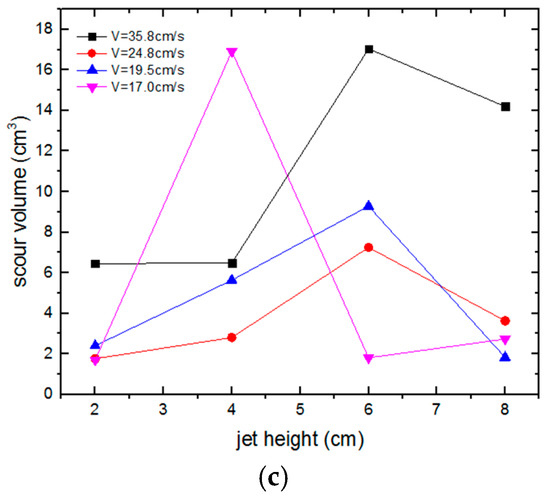 (a) Variation of the scour volume with jet height (D = 75 µm). (b) Variation of the scour volume with jet height (D = 120 µm). (c) Variation of the scour volume with jet height (D = 212 µm).