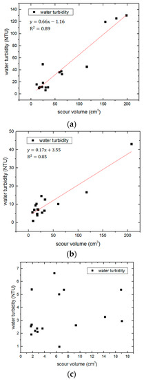 (a) Correlation between the scour volume and turbidity (D = 75 µm). (b) Correlation between the scour volume and turbidity (D = 120 µm). (c) Correlation between the scour volume and turbidity (D = 212 µm).