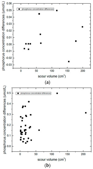 (a) Variation of phosphorus concentration differences with scour volume (C = 0.011 g/L). (b) Variation of phosphorus concentration differences with scour volume (C = 0.5 g/L).