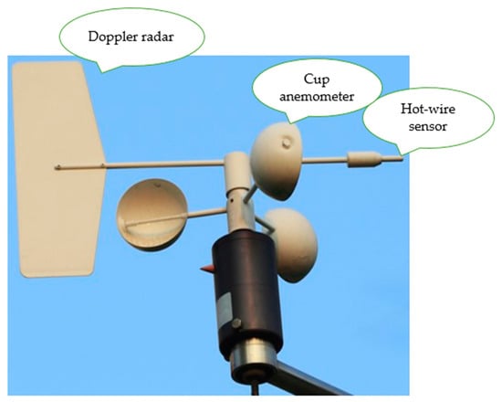 The hot wire form of anemometer used in environmental research, in which the hot wire electrically heated element is lowered down in temperature by the wind, and the heat loss rate is measured as wind speed, which is depicted in Figure 4 [37]. Unlike mechanical wind meters, these devices have a rapid response time and a lack of mechanically moveable parts, which are installed near the ground or inside the system, where it can measure small vortices and the impact of the local climate. However, relative unit spending is prohibitive for many environmental applications [78,79,80,81].