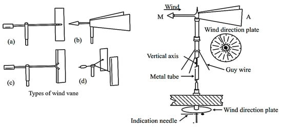 The weathervane has two metal plates, one for the cup type weathervane and other for the Y-shaped vane shown in Figure 5 [39]. The cup and moving angles are about 20 degrees, and weight; M is attached to the upper part of the shoulders to maintain balance. Steel pipes pass through the top and are connected to the roof, and the shafts are connected by steel. For indicate the rotational angle of the blade, the compass mounted directly on the rotation axis. To remotely indicator the rotation angle of the blade, a Selwyn potentiometer or motor is mounted on the rotation shaft. Previous studies have improved the measurement of wind forecasting by using an anemometer and are tabulated in Table 1, while selected methods of anemometer-based wind-forecasting measurement are presented in Table 2.