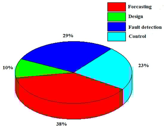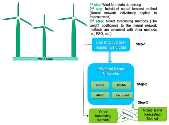 The capacity of ANNs for learning simulations in this manner has enabled them to adapt well to any application, especially where the dominion has not been well defined, such as in power generation by wind forecasting data. A three-layer power architecture was implemented as the system forecasting with the perceptron of the neural network. Based on the previous wind speed observations, the selection of input data was established on the correlation of the coefficients. The proposed technique is implemented to calculate the speed of wind without the required weather data, but in this case, the achieved accuracy can be poor. In Germany, the ANN approach is extensively used to forecast daily wind energy. ANN training is used to learn about the physical consistency of wind speed and wind energy production for forensic meteorological factors and calculated power data. Additionally, the ANN application can smoothly deploy the weather data, such as to identify air temperature or pressure to improve the accuracy of forecasting. This technique is better than other adopted approaches due to the power curves of individual plant observations. Figure 9 [92], shows ANN-based wind forecasting, model design, system fault diagnosis, and control methods, where it can be observed that forecasting is more-essential, which is 38%. In contrast, Table 4 shows the previous five years’ (2014–2018) studies on ANN-hybrid systems. Figure 10 illustrates the individual and mixed/hybrid neural network methods for wind forecasting.