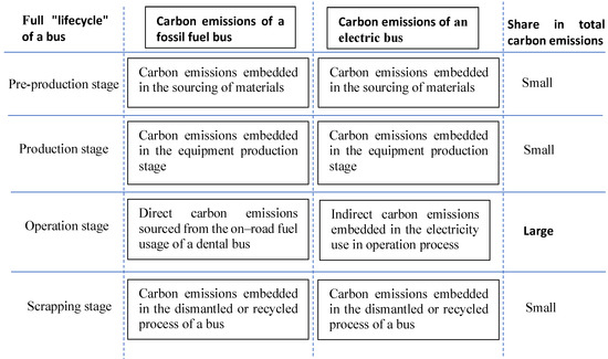 6]. As a result, when evaluating the emission reduction effect and the corresponding economic value of bus electrification, i.e., the process for BEBs to replace FFBs, a lifecycle carbon footprint insight is needed. The components and features of the lifecycle carbon emissions of a fossil fuel or electric bus are shown in